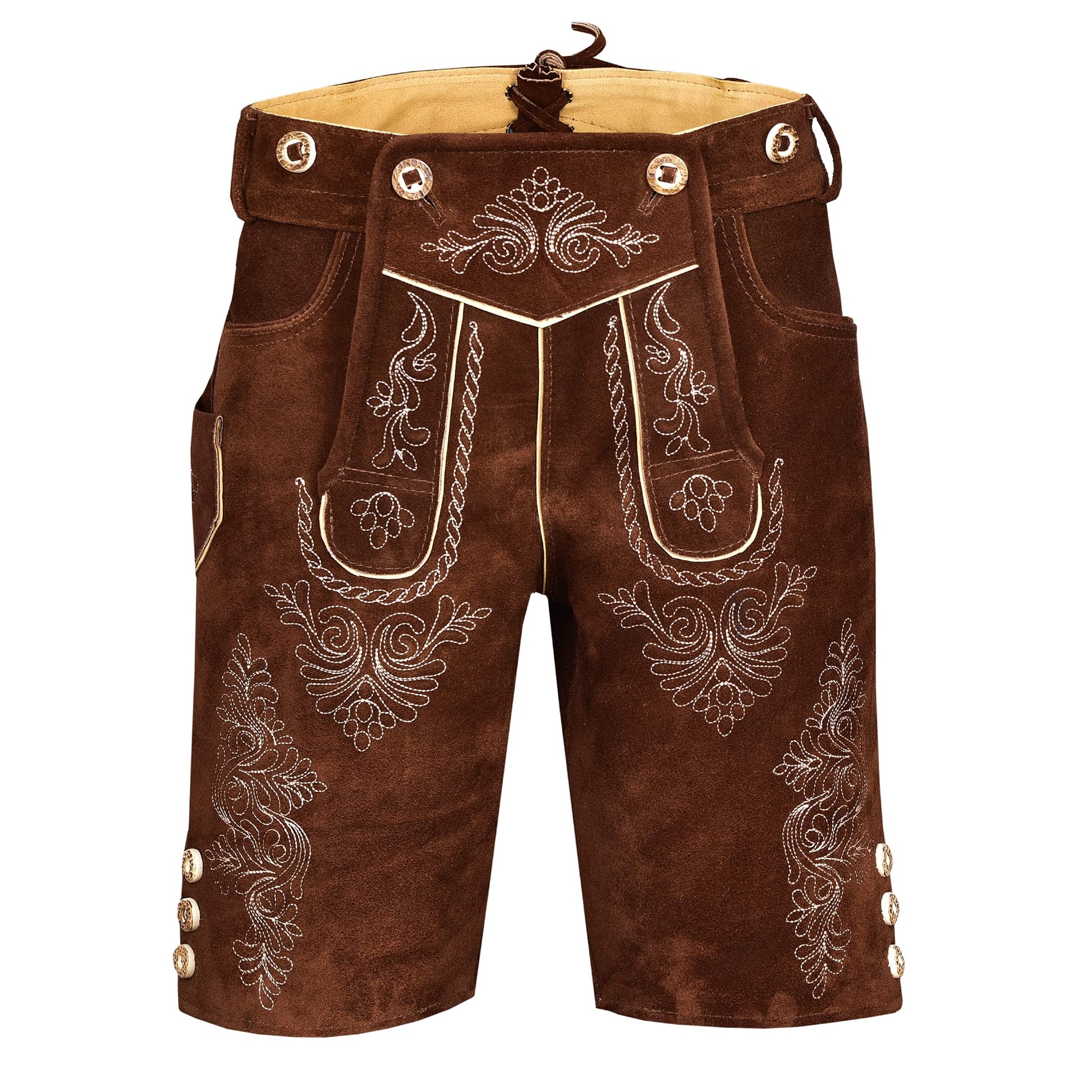 - Premium Cowhide Suede Leather: Our Lederhosen are made from 100% superior Quality Cowhide suede leather. The high end quality durable stitching alone with master quality Suspenders.